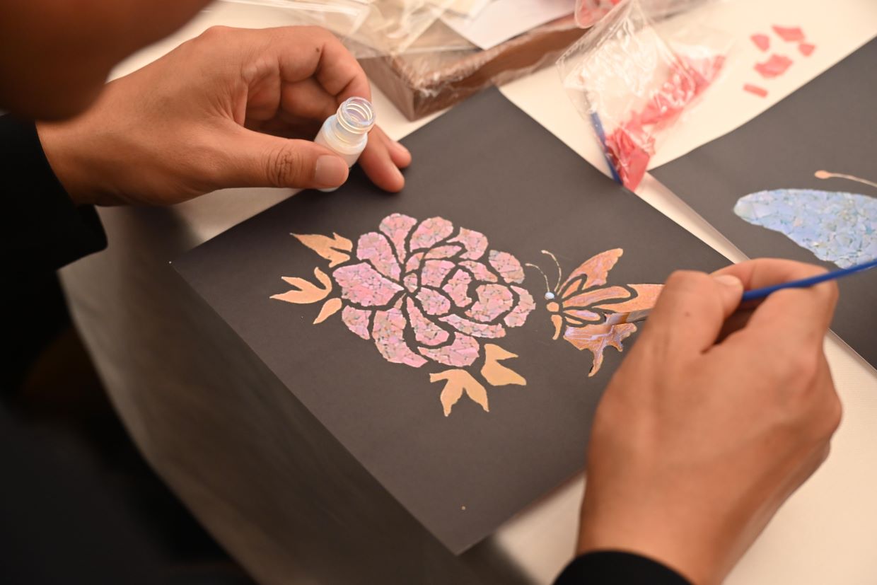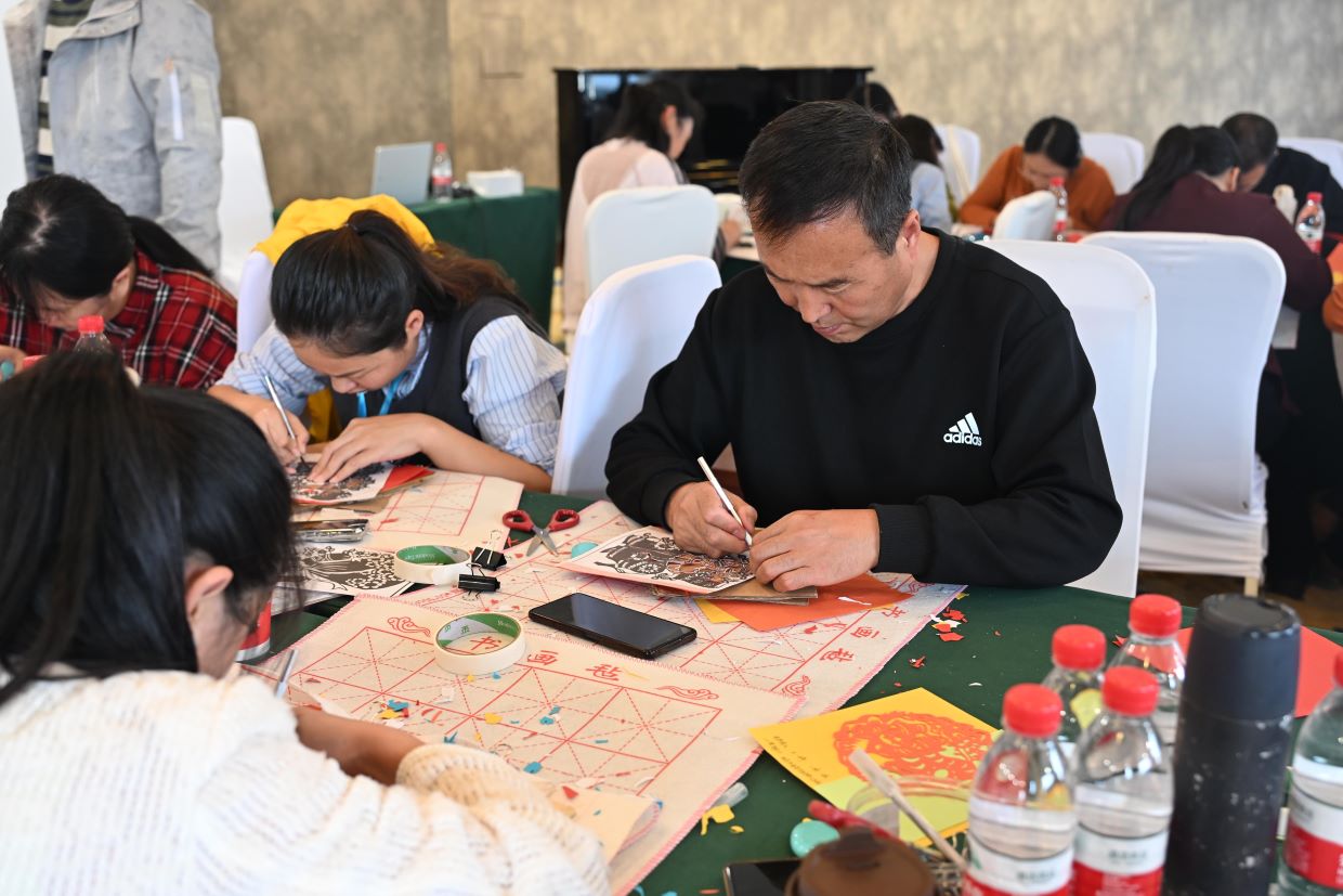 在《非物质文化遗产—螺钿课程》上学员们亲手做螺钿画;《非遗实践—在地剪纸课程》填补了大家在美育理论与传统美术实践上的短板,为未来的教学指明方向;《非遗实践课—烧箔画》摒弃生硬照搬,通过学员们的亲手创造,将传统文化自然而深刻地融入了当代创作,并绽放出新的生命力;作为本期培训的美育实践课程的亮点,非物质文化遗产的完整知识体系与核心工艺技能在本次美育培训中得到很好的展示。学员们完成符合学术规范的创作实践,更将培养起从物质性出发,批判性地审视技术与艺术、传统与创新之间辩证关系的研究能力。进一步促进不同地区的学员根据具有当地特色的材料和艺术形式,进行美术课程的开发和应用;《在地版画实践—黑白油印》崔德政老师的从“理念升华”与“技能落地”两个维度,为学员们打通了从理论认知到课堂实践的关键通道;《综合材料编织课》中,学员们展示关于“空间与当代艺术创作”的分享,以趣味化、生活化的方式为学员们在乡村美术教学提供新方法。
