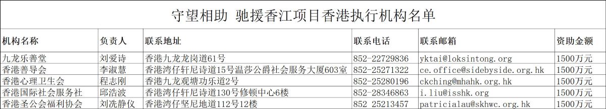 一、12月1日下午14时至16时,“守望相助 驰援香江”慈善项目签约仪式在中国社会福利基金会会议室举行。会上,中国社会福利基金会正式宣布向九龙乐善堂、香港善导会、香港心理卫生会、香港国际社会服务社、香港圣公会福利协会等五家香港慈善组织,每家资助人民币1500万元,共计拨付7500万元善款,支持上述五家香港慈善组织开展遇难者家属抚慰;受伤者医疗和康复;受灾群众生活救助;受灾群众心理服务和社工支持等方面的工作。上述五家组织的授权代表分别在委托协议上签字。