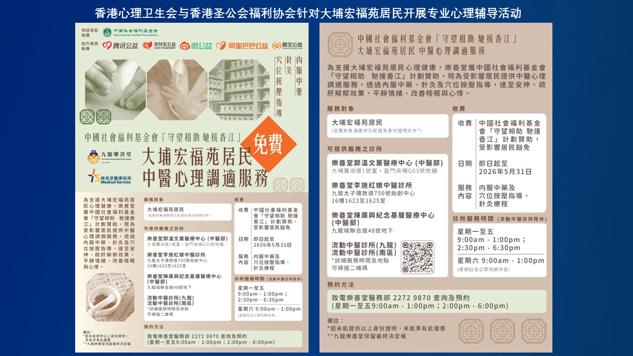 二、香港心理卫生会与香港圣公会福利协会针对大埔宏福苑居民,累计开展了400余人次的专业心理辅导活动,协助受灾群体缓解灾后创伤。
