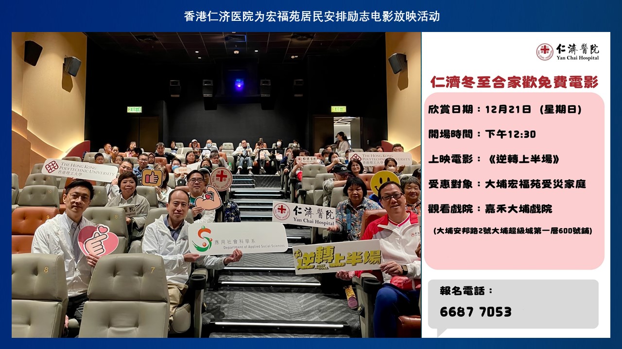 四、12月22日(冬至)期间,合作机构仁济医院特别为宏福苑居民安排了励志电影《逆转上半场》的放映活动 。通过节日期间的人文关怀,为受灾居民在艰难时期提供了心理慰藉与喘息空间。