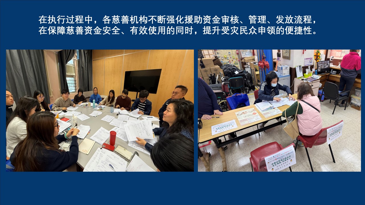 目前,各机构共累计处理电话查询732个,工作人员耐心解答居民关于申请流程、资格及证明文件的疑问,累计收到援助申请1878份,累计发放援助资金折合港币5500万余元。各承办机构正紧锣密鼓地进行审核,将援助金直接存入受灾同胞的银行账户,确保资金安全、快速触达。