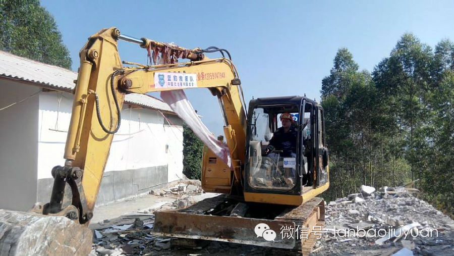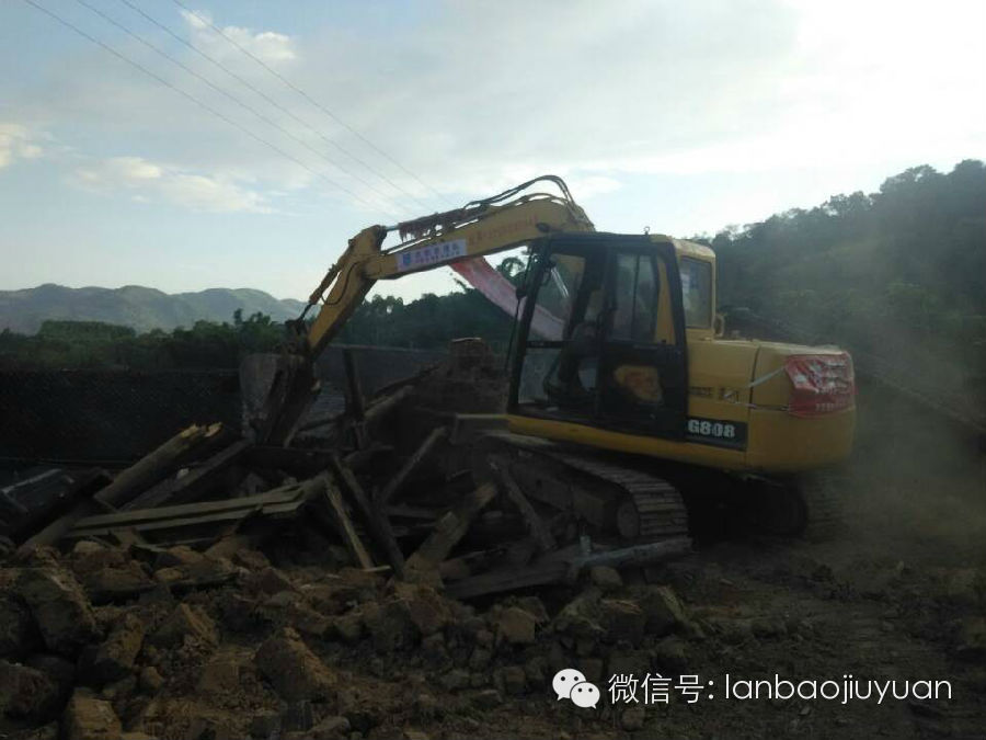 8:35蓝豹救援队三名队员在蓝豹救援队工程机械分队挖掘机配合下,继续对昨日尚未完工的迁糯村危房进行危房拆除工作,通过昨天的清障工作之后,今天顺利将危房主体拆除并进行了地基的平整工作。