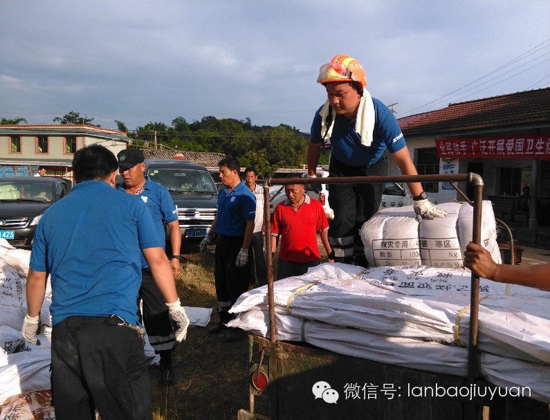 16:45蓝豹救援队四名队员在营地协助村委会分发救灾物资帐篷、棉被、彩条布共117件。