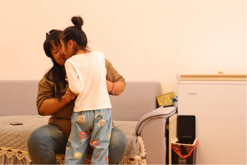 2020 年,康复中心通过残联找到这家人,实地探访后决定帮助嘉嘉进行康复训练。这成了一家人黑暗里的一道光。刚开始康复时,嘉嘉腿没劲儿,眼神空洞,喊她名字像没听见一样。嘉嘉妈妈和姥姥每天陪着女儿做肌力训练、练平衡,有时候一个简单的站立动作,要练上几十遍。“孩子累得哭,我也跟着哭,可哭完还得接着练,我怕一停下,她就真的站不起来了。”